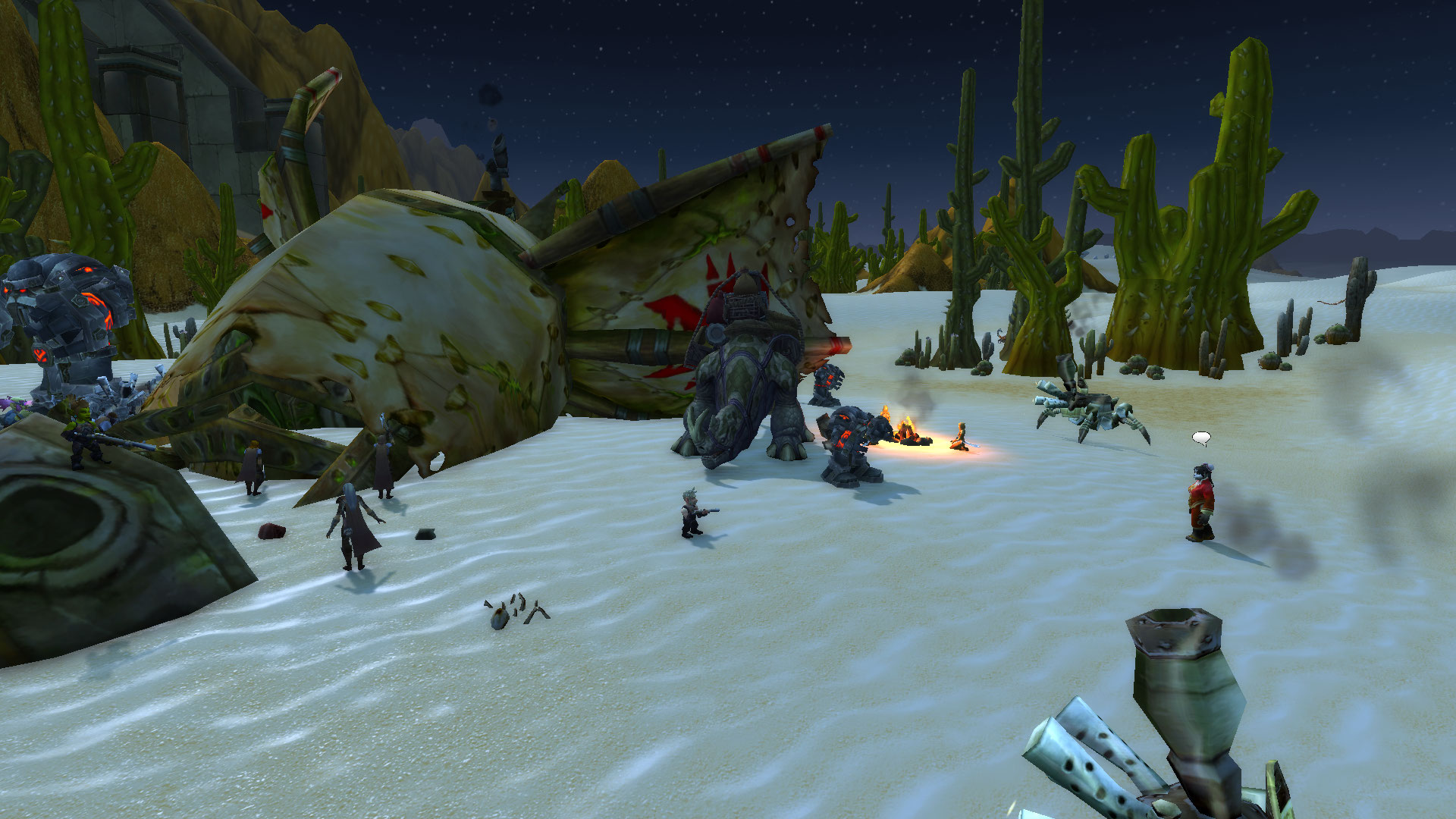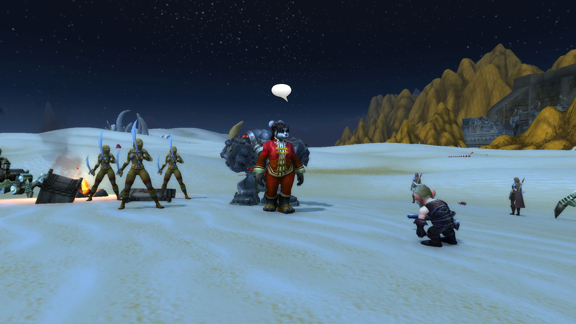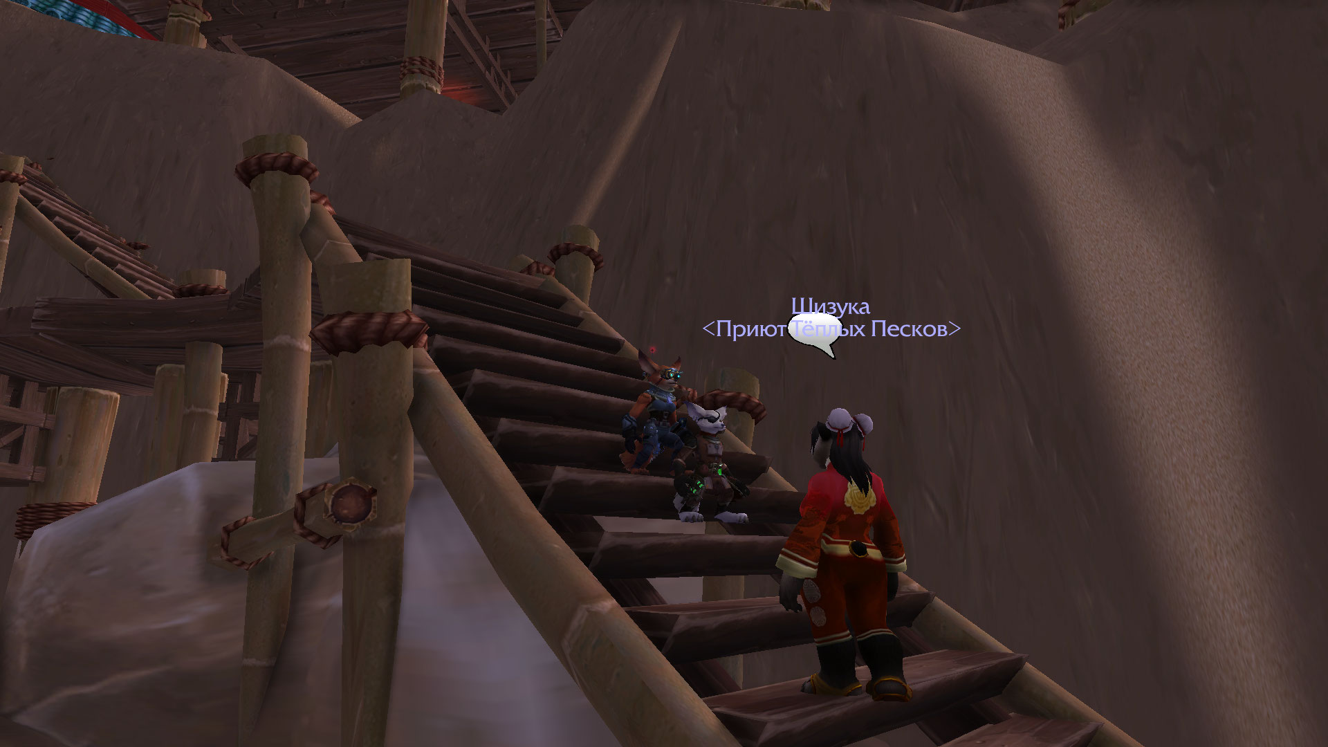 Шизука отправилась спустя несколько минут напрямик к врагу, по пути отработав свою сценку нелепой девицы, спотыкаясь в песках, и не страшась быть застреленой. Храбрость та была подкреплена тем, что враг не знал кто такая Шизука на самом деле, и тем, что они не могли быть уверены, что молодая дурочка из Пандарии могла знать, что они — бандиты, а не выжившие при крушении экипаж. Её встретил гном, вооружённый винтовкой и сильно вошедший в ступор от вида Шизуки. Посреди пустыни, из ниоткуда появляется пандаренка и жаждет помочь выжившим. Благо, бригадир этой группы бандитов дал добро и пустил её в лагерь с целью вылечить раненую стопу кодо. Шизука стала тянуть время как могла глупыми расспросами, но и не мешкалась в лечении единственного раненого пациента — кодо, который как-то подвернул ногу. В своих распросах, Шизука узнала лишь имя Кодо — Бочек. А вот имени гнома так и не удалось получить. Он увиливал от ответов и всячески торопил Шизуку. Пока она играла свой спектакль — По правое плечо от неё были бандиты с саблями, гном с пушкой по левую, и позади нагнетающе стоял меха-дворф. Нервы давали о себе знать… Почему этот лис так долго? Шизука ждала его сигнала, что и было единственным изъяном плана — кто даст сигнал к наступлению?