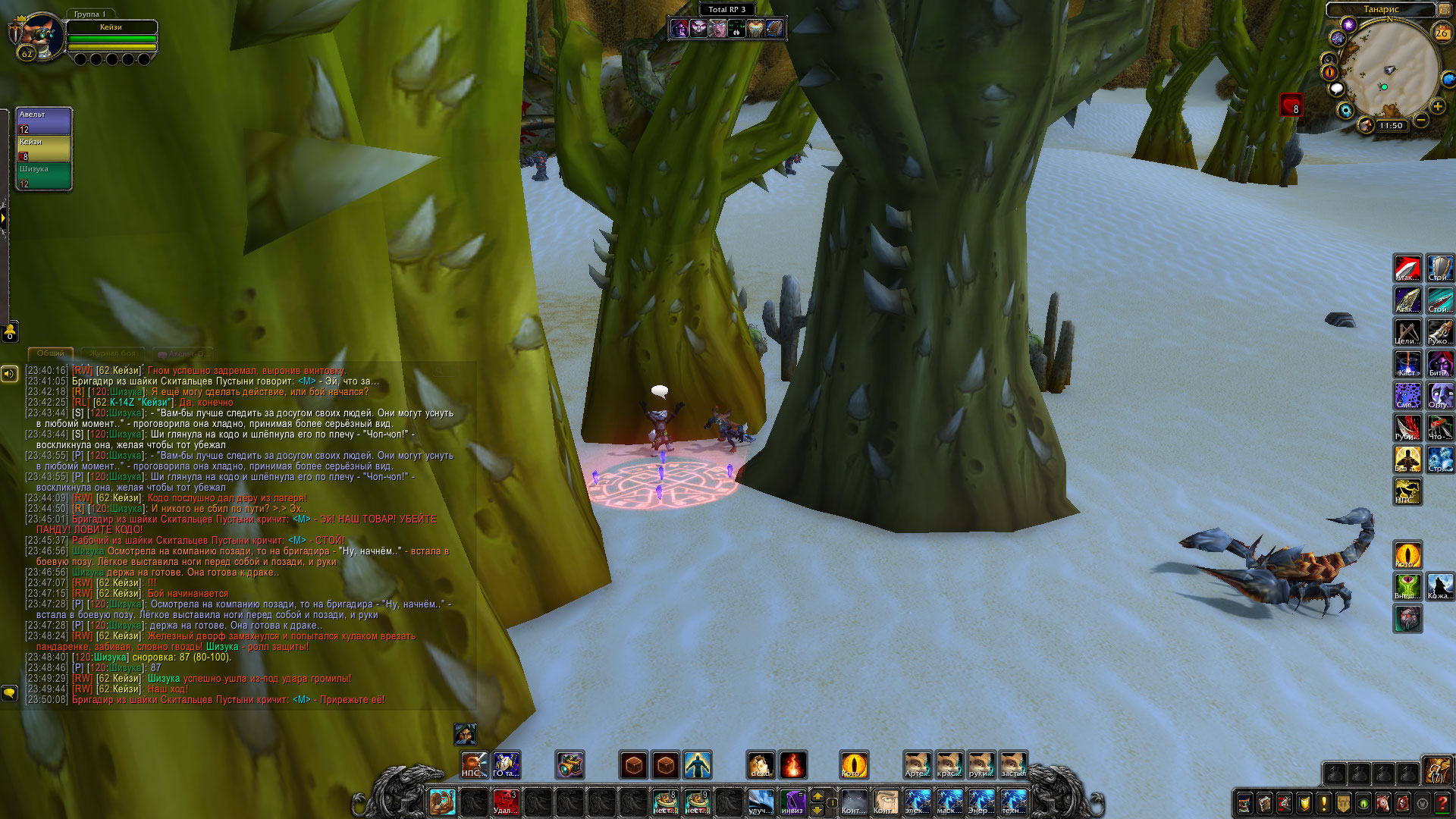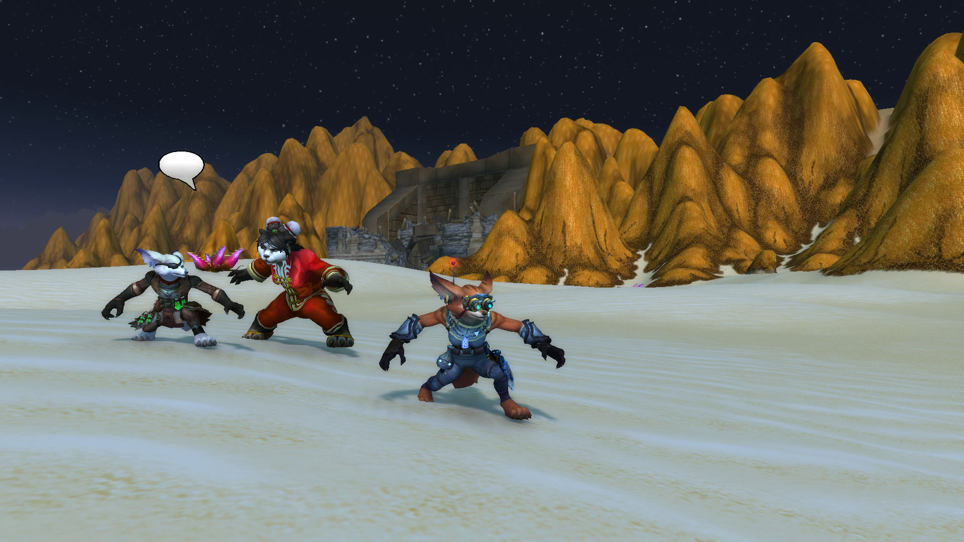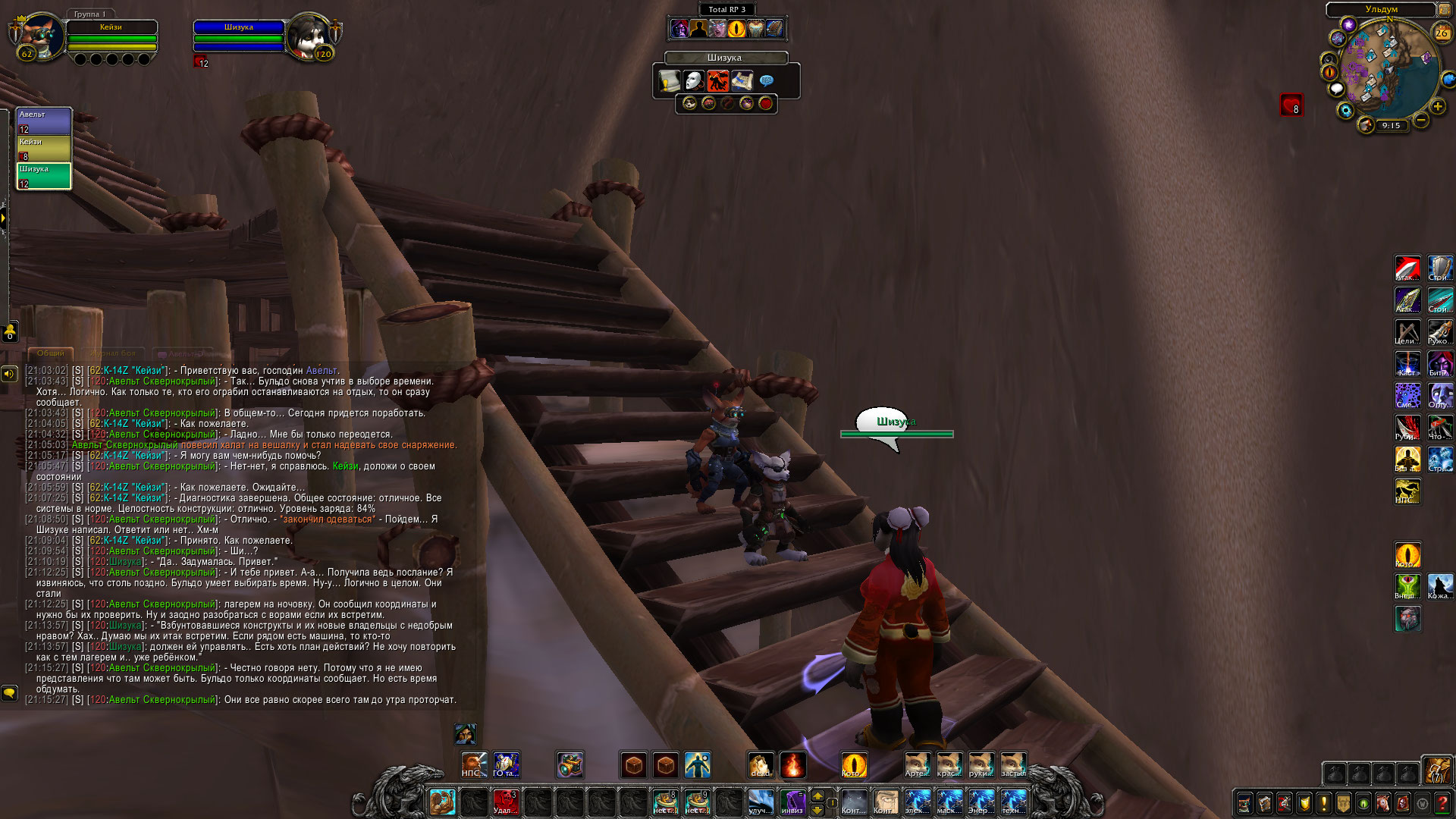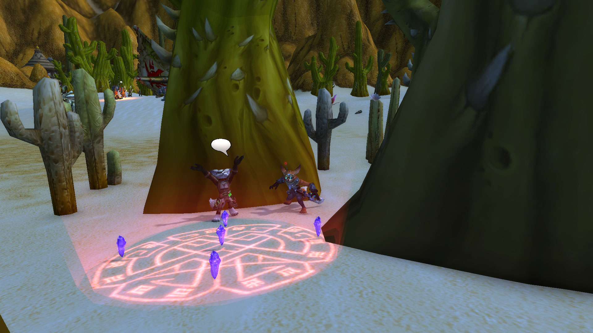 Шизука отправилась спустя несколько минут напрямик к врагу, по пути отработав свою сценку нелепой девицы, спотыкаясь в песках, и не страшась быть застреленой. Храбрость та была подкреплена тем, что враг не знал кто такая Шизука на самом деле, и тем, что они не могли быть уверены, что молодая дурочка из Пандарии могла знать, что они — бандиты, а не выжившие при крушении экипаж. Её встретил гном, вооружённый винтовкой и сильно вошедший в ступор от вида Шизуки. Посреди пустыни, из ниоткуда появляется пандаренка и жаждет помочь выжившим. Благо, бригадир этой группы бандитов дал добро и пустил её в лагерь с целью вылечить раненую стопу кодо. Шизука стала тянуть время как могла глупыми расспросами, но и не мешкалась в лечении единственного раненого пациента — кодо, который как-то подвернул ногу. В своих распросах, Шизука узнала лишь имя Кодо — Бочек. А вот имени гнома так и не удалось получить. Он увиливал от ответов и всячески торопил Шизуку. Пока она играла свой спектакль — По правое плечо от неё были бандиты с саблями, гном с пушкой по левую, и позади нагнетающе стоял меха-дворф. Нервы давали о себе знать… Почему этот лис так долго? Шизука ждала его сигнала, что и было единственным изъяном плана — кто даст сигнал к наступлению?