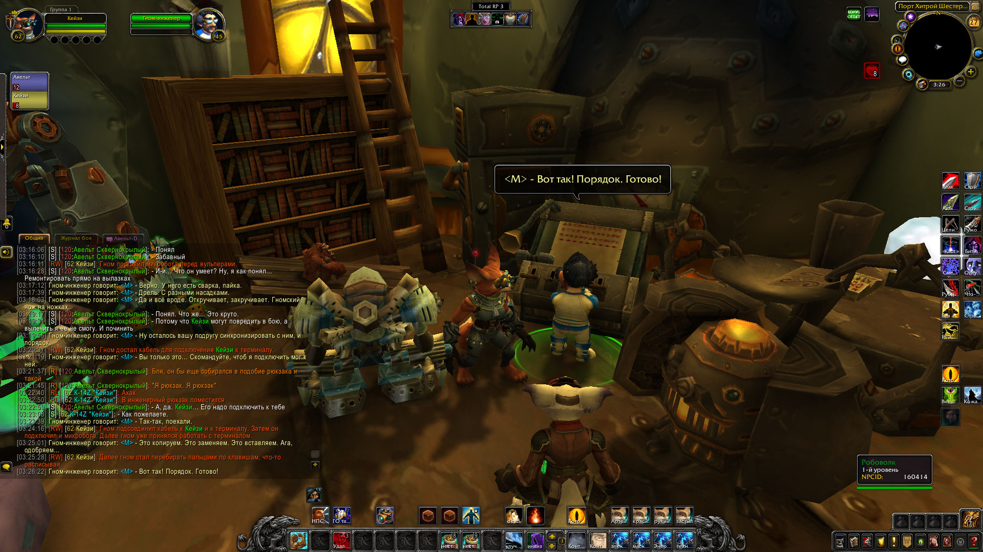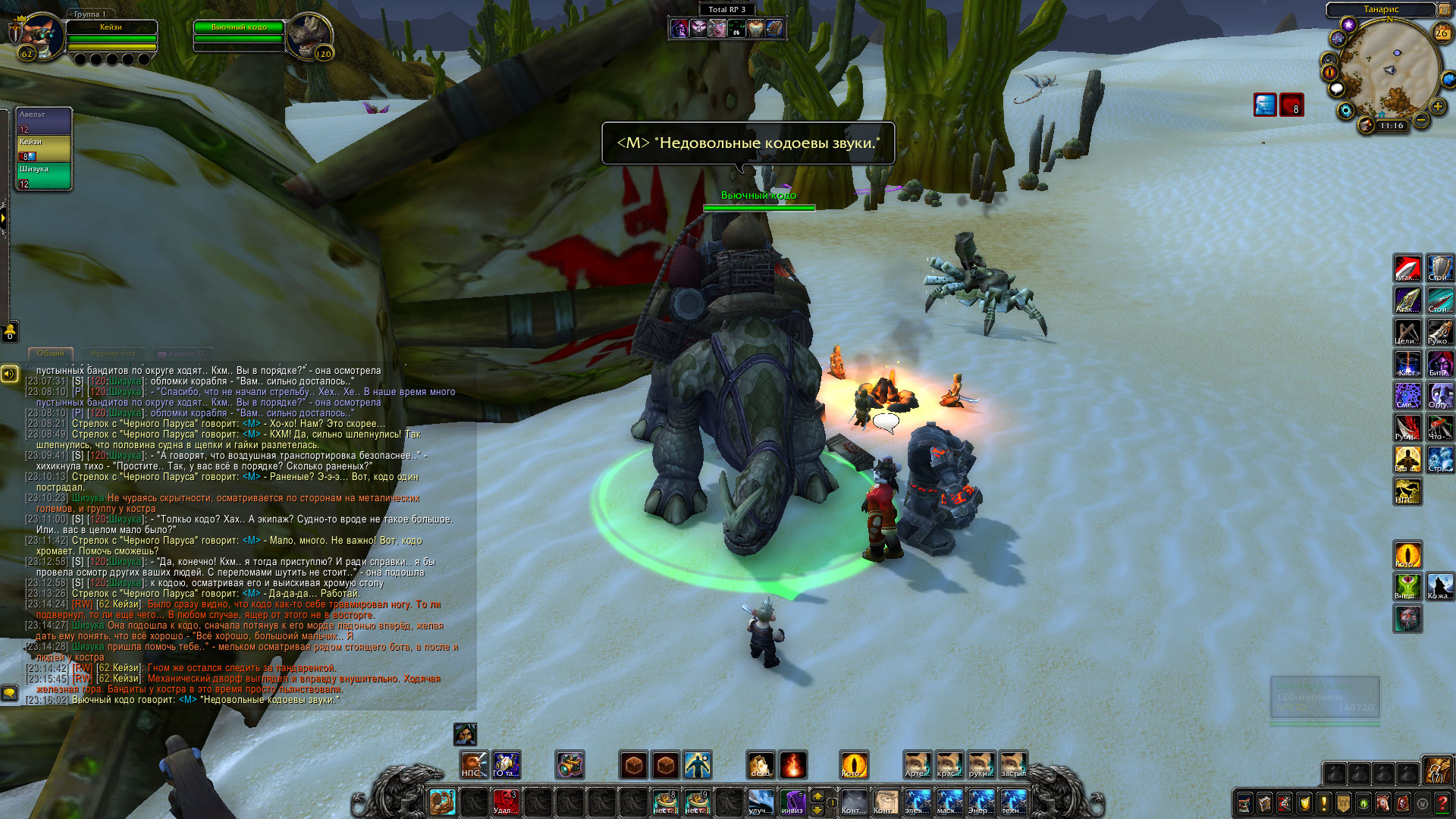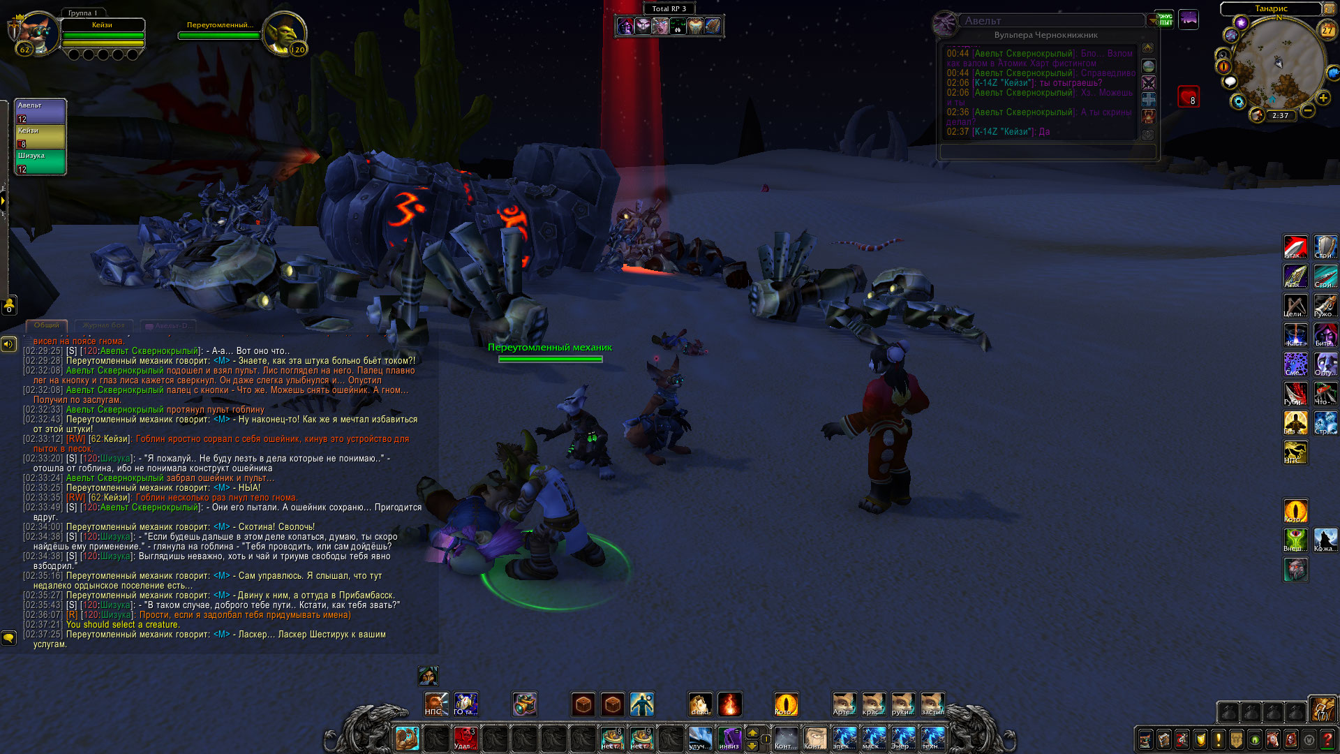 Авельт и его команда при поддержке Бульдо Быстрогона одолеть ещё одну группировку той загадочной банды, что таскает при себе кучу техники. Механические дворфы были отключены и доставлены обратно Бульдо. Гном в свою очередь позаботился, чтобы часть его изобретений была переправлена из Танариса обратно в Каз Модан, чтобы служить во благо общество. Шизука вылечила кодо по имени Бочек и помогла освобожденному из плена гоблину Ласкеру, который позднее отправился в Прибамбасск, чтобы предупредить своих боссов об этих бандитах. Авельт в ходе обыска тел убитых механиков бандитов прибрал к своим лапам крутые гномские инженерные очки, а также забрал себе электрический ошейник с пультом от него, что был у гнома-прораба. Также группа получила от Бульдо в распоряжение робота-помощника, который будет проводить полевой ремонт, а также переносной генератор защитного поля. Генератор необходимо проверить в деле перед тем, как его можно использовать в бою.