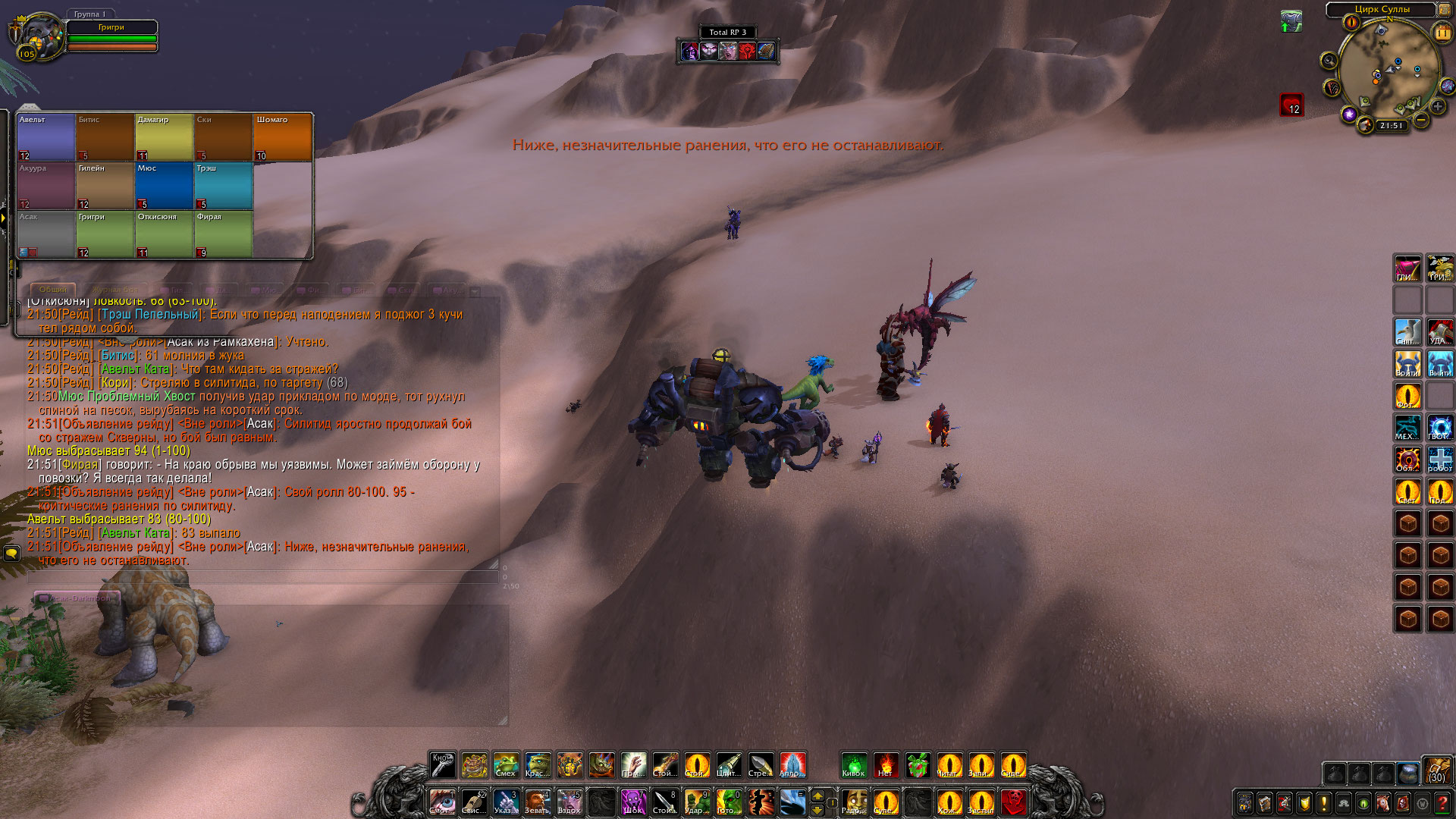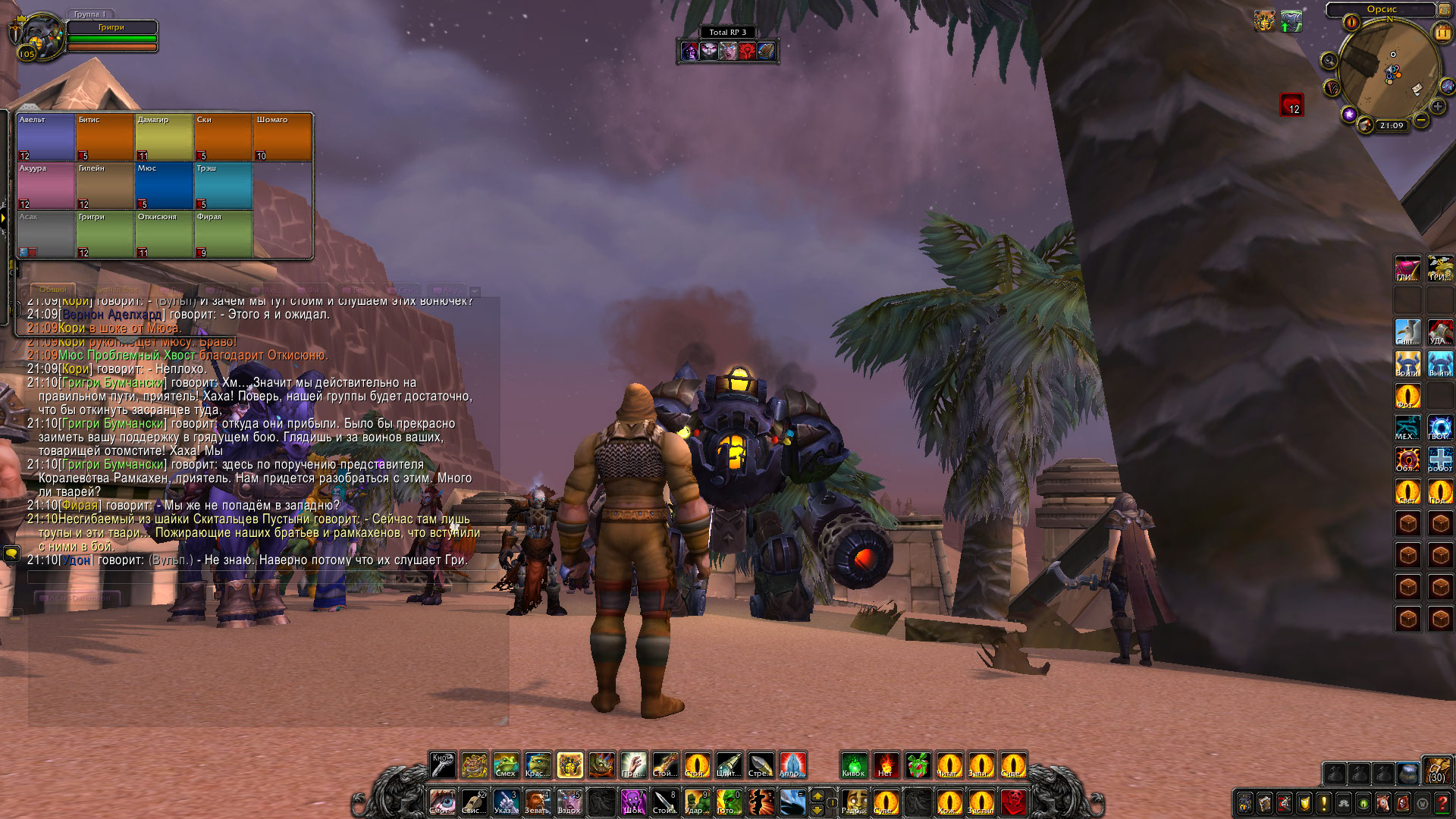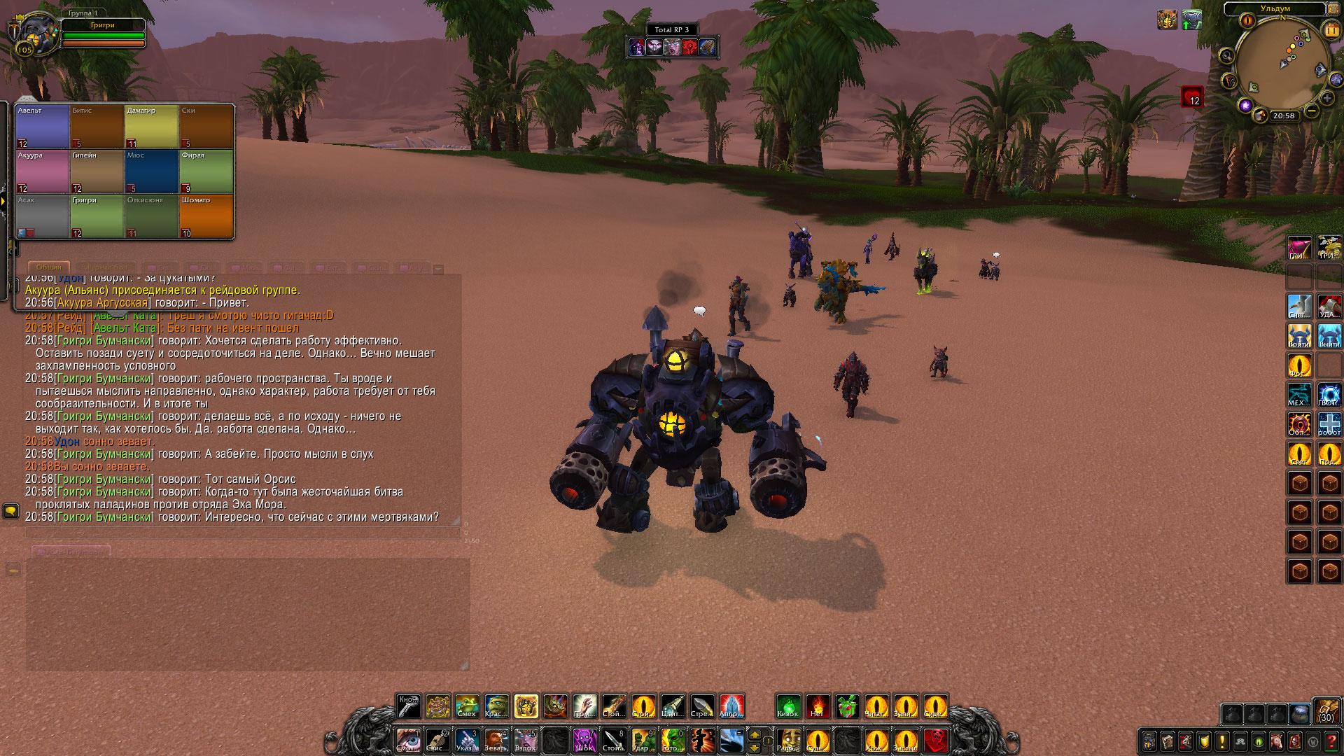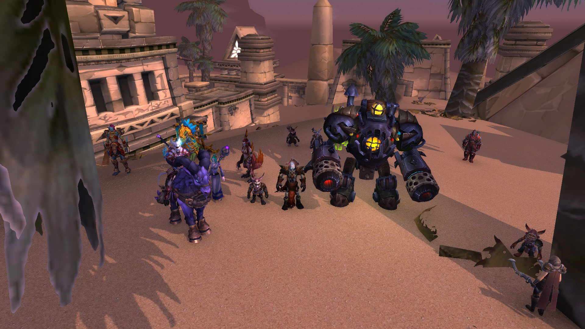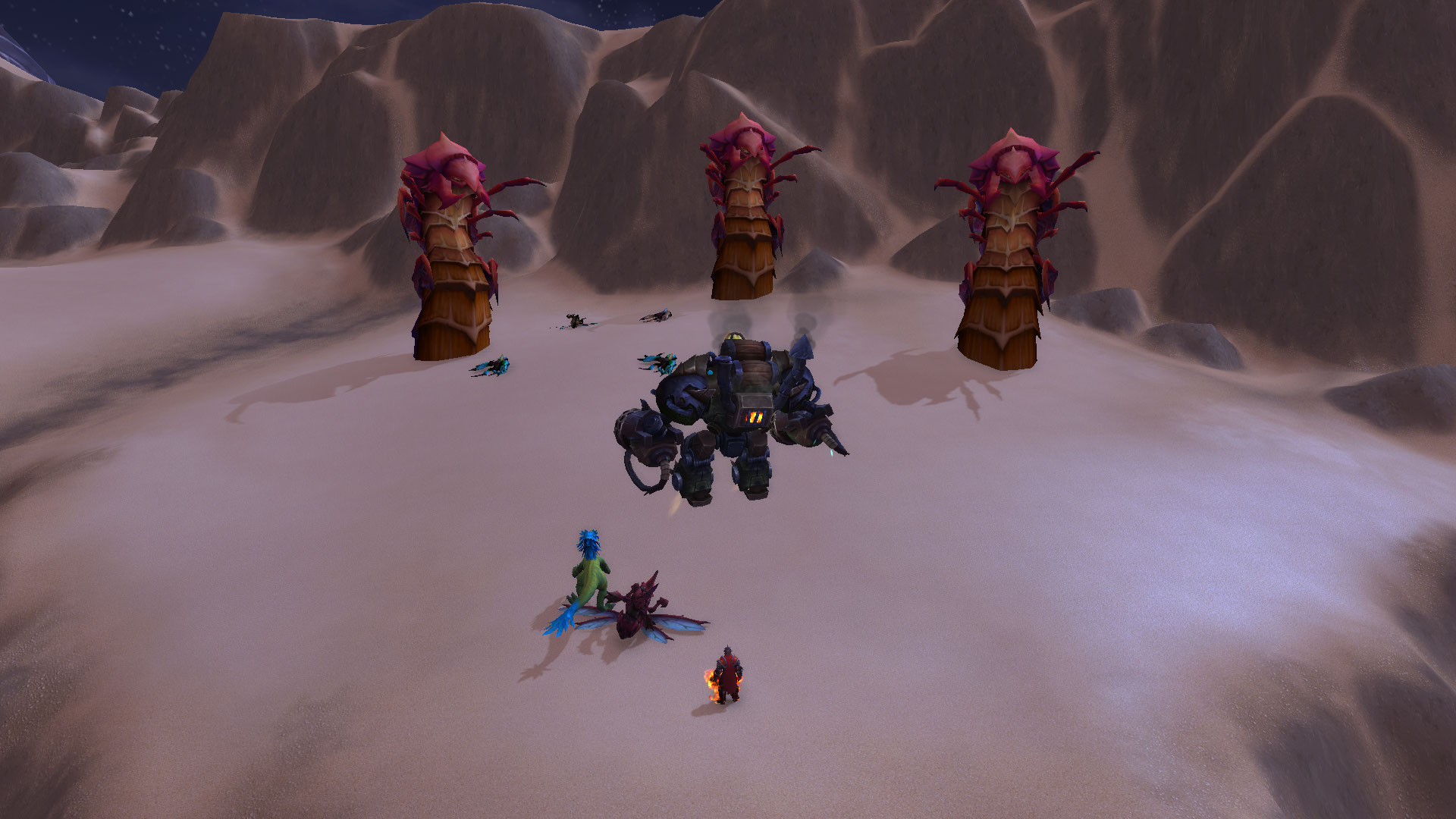 Кратко о задачах: Разузнать о том, что происходит у Храма Ульдума. Подтвердить наличие силитидов. Перебить как можно больше без серьезных рисков. После сборов в Храме Рамкахен, боевая группа направилась на северо-запад к руинам храма Орсис. Предстояло убедиться в охвате территории, заполненной тварями. Там, на удивление, было тихо. Лишь группа скитальцев пустыни встретила своим взором и кличем проходящих мимо бойцов. Те в раненом и измотанном виде предостерегли отправляющихся на потенциально верную смерть путников. В Храм Ульдума было идти опасно. Скитальцы потеряли там свой караван с огромным количеством бойцов. Теперь тем не остается ничего, кроме как направляться в другую часть пустыни. Те пока взяли передышку, переговорив с Начальником Бумчански о положении дел в храме. Скитальцы сообщили о тварях под землей, намекая своими речами о невероятной мощи местной фауны. Стоит быть осторожнее. Однако, Григри те предостережения были по боку. У него толпа наемников и авантюристов позади. А сам гоблин в огромном железном мехе ГРИЖС. Кажется, тот совсем не видел препятствий для продолжения операции.