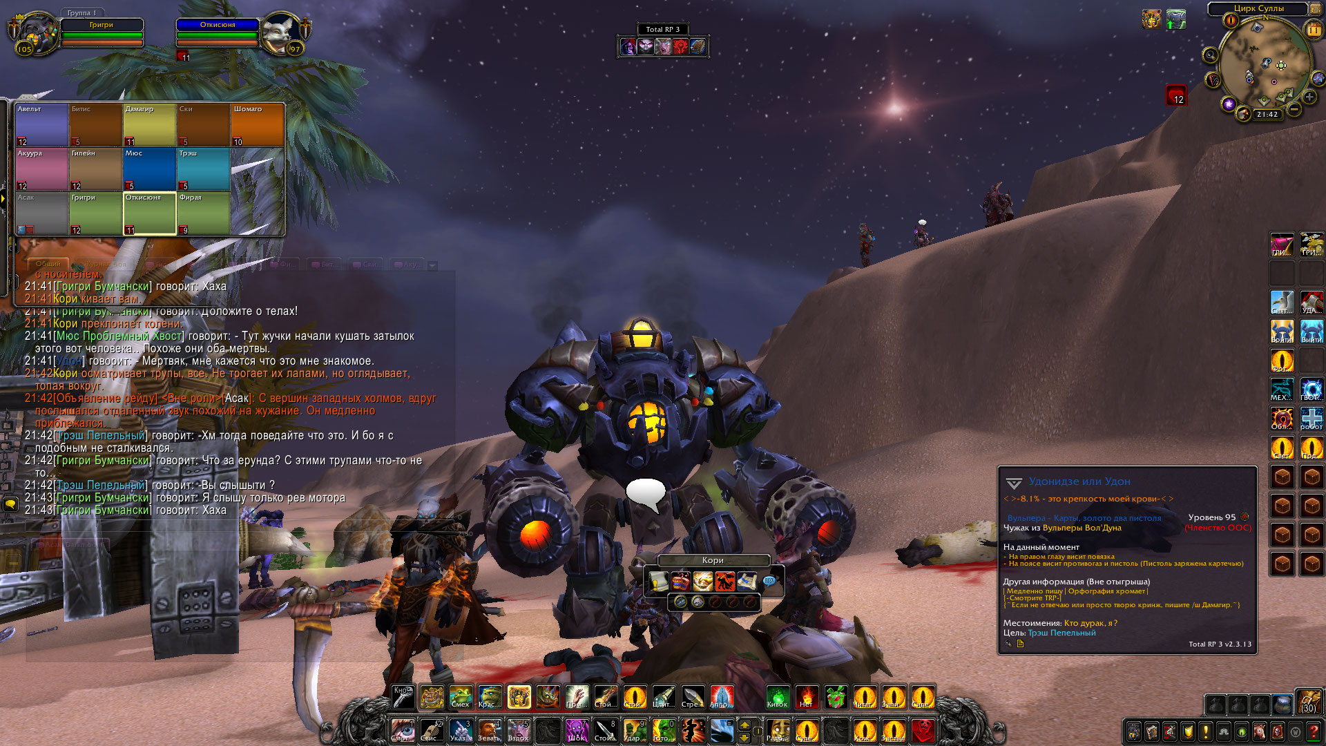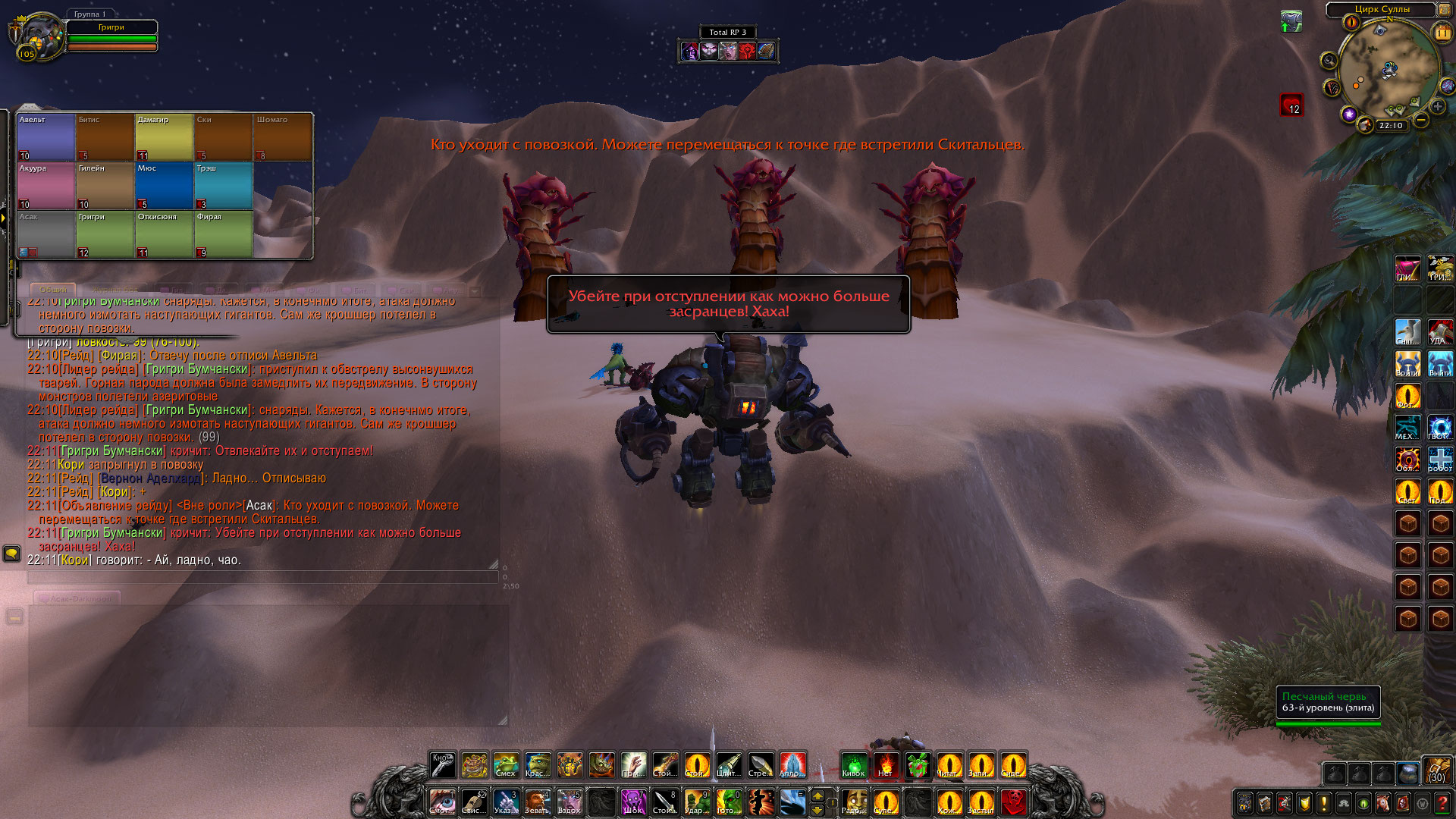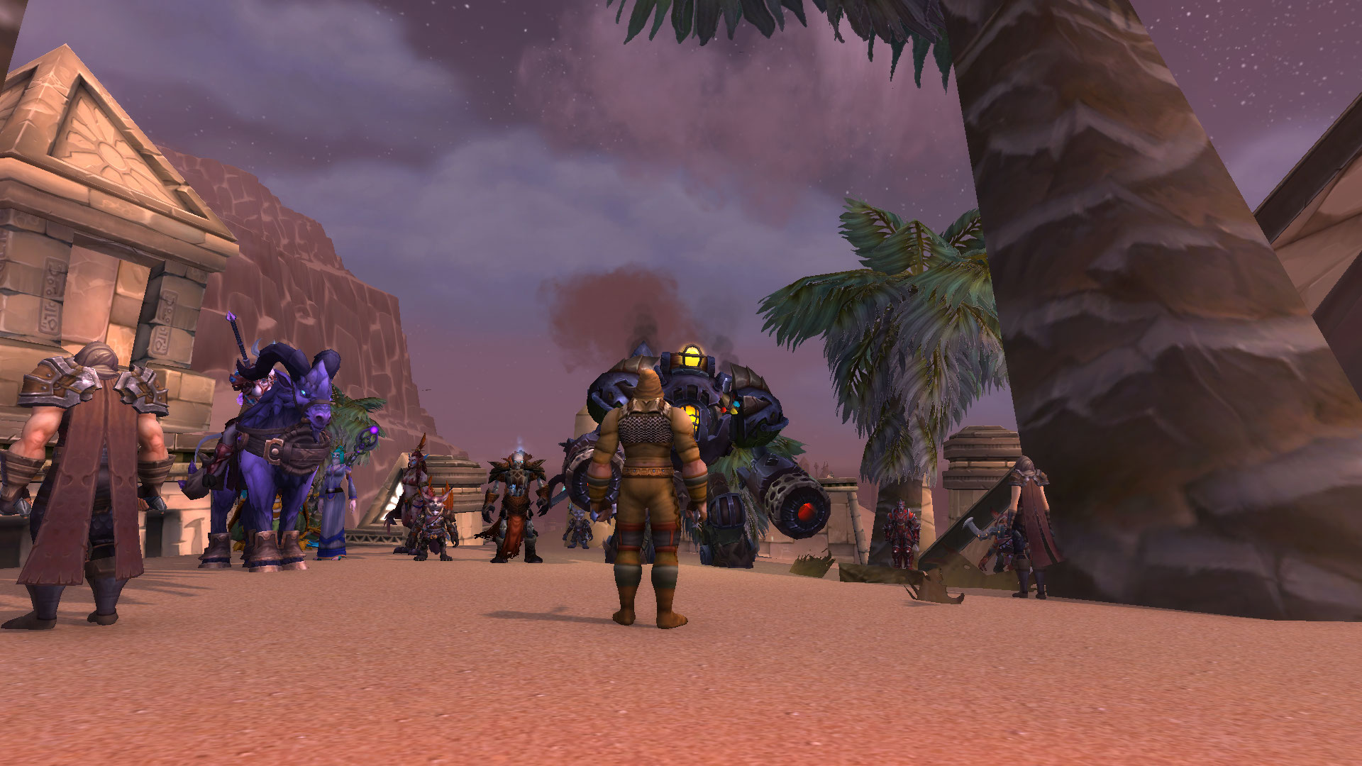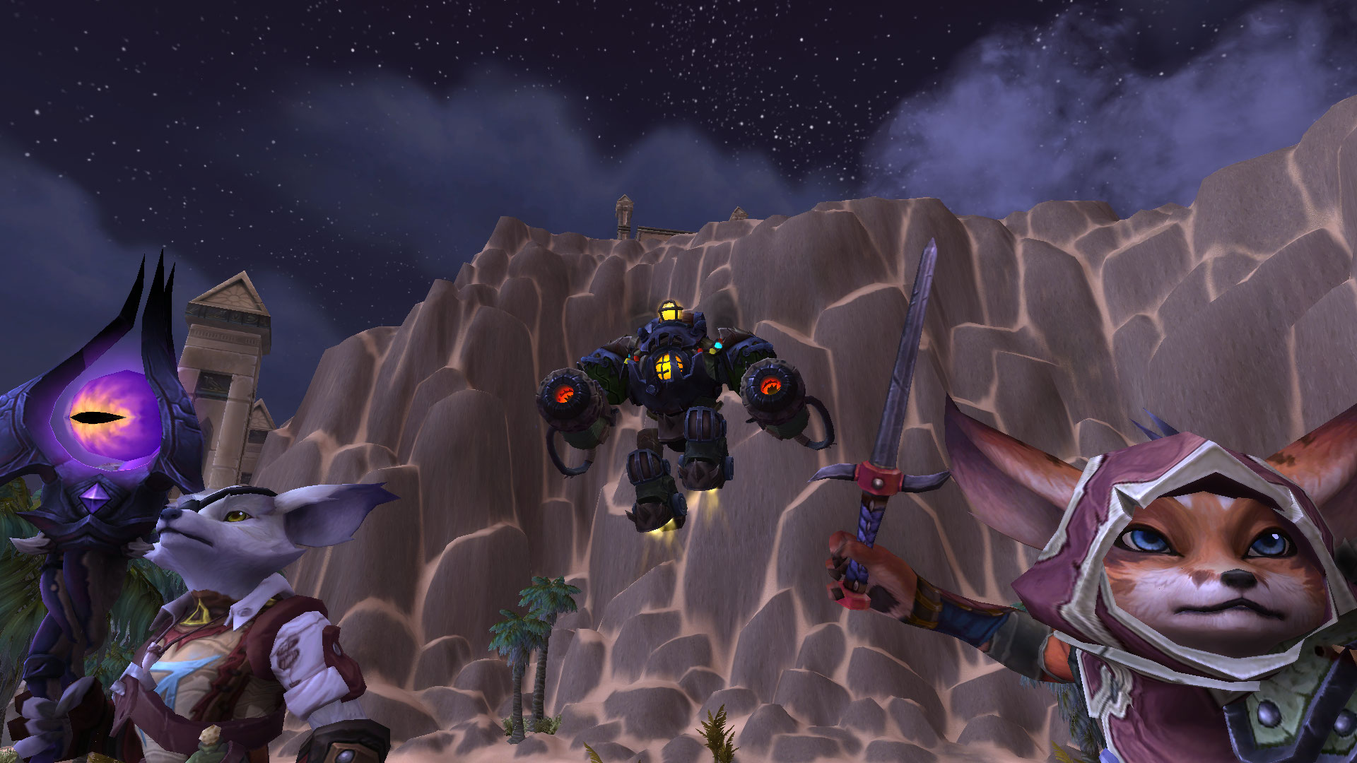 Кратко о задачах: Разузнать о том, что происходит у Храма Ульдума. Подтвердить наличие силитидов. Перебить как можно больше без серьезных рисков. После сборов в Храме Рамкахен, боевая группа направилась на северо-запад к руинам храма Орсис. Предстояло убедиться в охвате территории, заполненной тварями. Там, на удивление, было тихо. Лишь группа скитальцев пустыни встретила своим взором и кличем проходящих мимо бойцов. Те в раненом и измотанном виде предостерегли отправляющихся на потенциально верную смерть путников. В Храм Ульдума было идти опасно. Скитальцы потеряли там свой караван с огромным количеством бойцов. Теперь тем не остается ничего, кроме как направляться в другую часть пустыни. Те пока взяли передышку, переговорив с Начальником Бумчански о положении дел в храме. Скитальцы сообщили о тварях под землей, намекая своими речами о невероятной мощи местной фауны. Стоит быть осторожнее. Однако, Григри те предостережения были по боку. У него толпа наемников и авантюристов позади. А сам гоблин в огромном железном мехе ГРИЖС. Кажется, тот совсем не видел препятствий для продолжения операции.