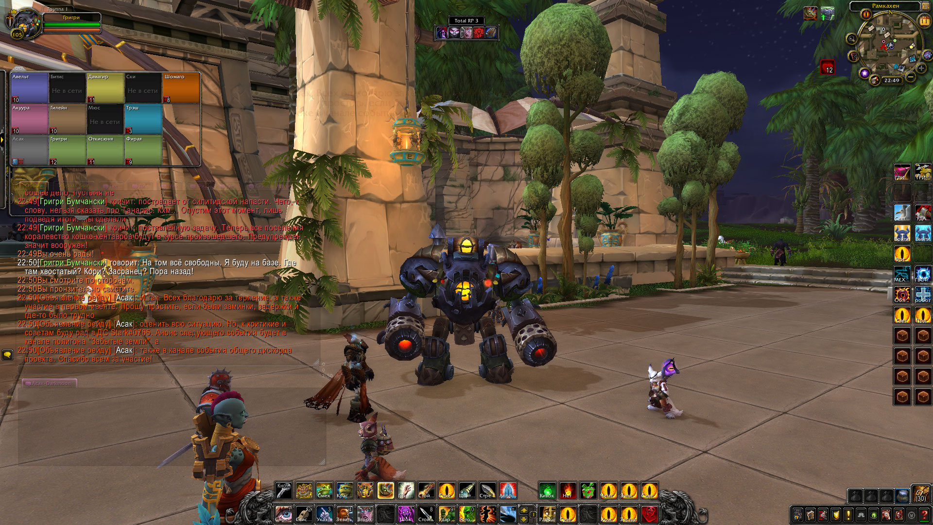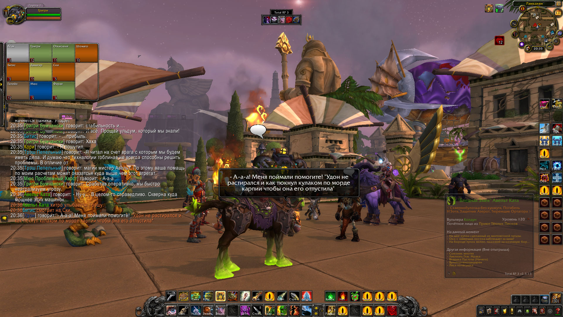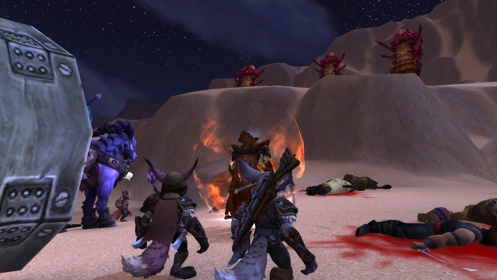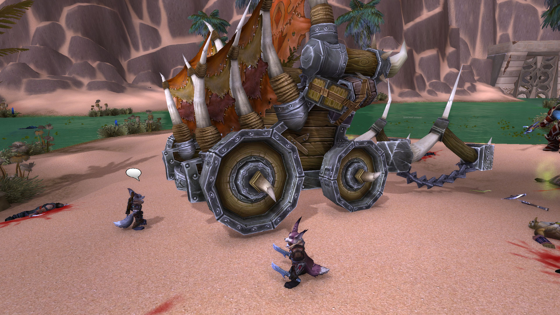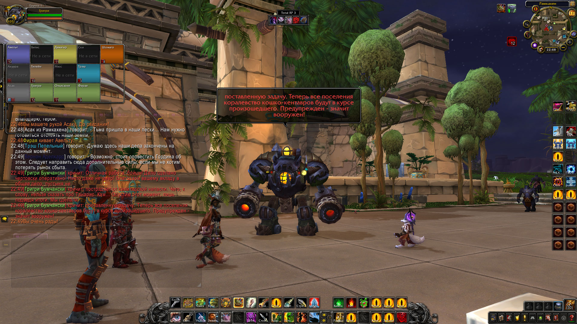 Кратко о задачах: Разузнать о том, что происходит у Храма Ульдума. Подтвердить наличие силитидов. Перебить как можно больше без серьезных рисков. После сборов в Храме Рамкахен, боевая группа направилась на северо-запад к руинам храма Орсис. Предстояло убедиться в охвате территории, заполненной тварями. Там, на удивление, было тихо. Лишь группа скитальцев пустыни встретила своим взором и кличем проходящих мимо бойцов. Те в раненом и измотанном виде предостерегли отправляющихся на потенциально верную смерть путников. В Храм Ульдума было идти опасно. Скитальцы потеряли там свой караван с огромным количеством бойцов. Теперь тем не остается ничего, кроме как направляться в другую часть пустыни. Те пока взяли передышку, переговорив с Начальником Бумчански о положении дел в храме. Скитальцы сообщили о тварях под землей, намекая своими речами о невероятной мощи местной фауны. Стоит быть осторожнее. Однако, Григри те предостережения были по боку. У него толпа наемников и авантюристов позади. А сам гоблин в огромном железном мехе ГРИЖС. Кажется, тот совсем не видел препятствий для продолжения операции.