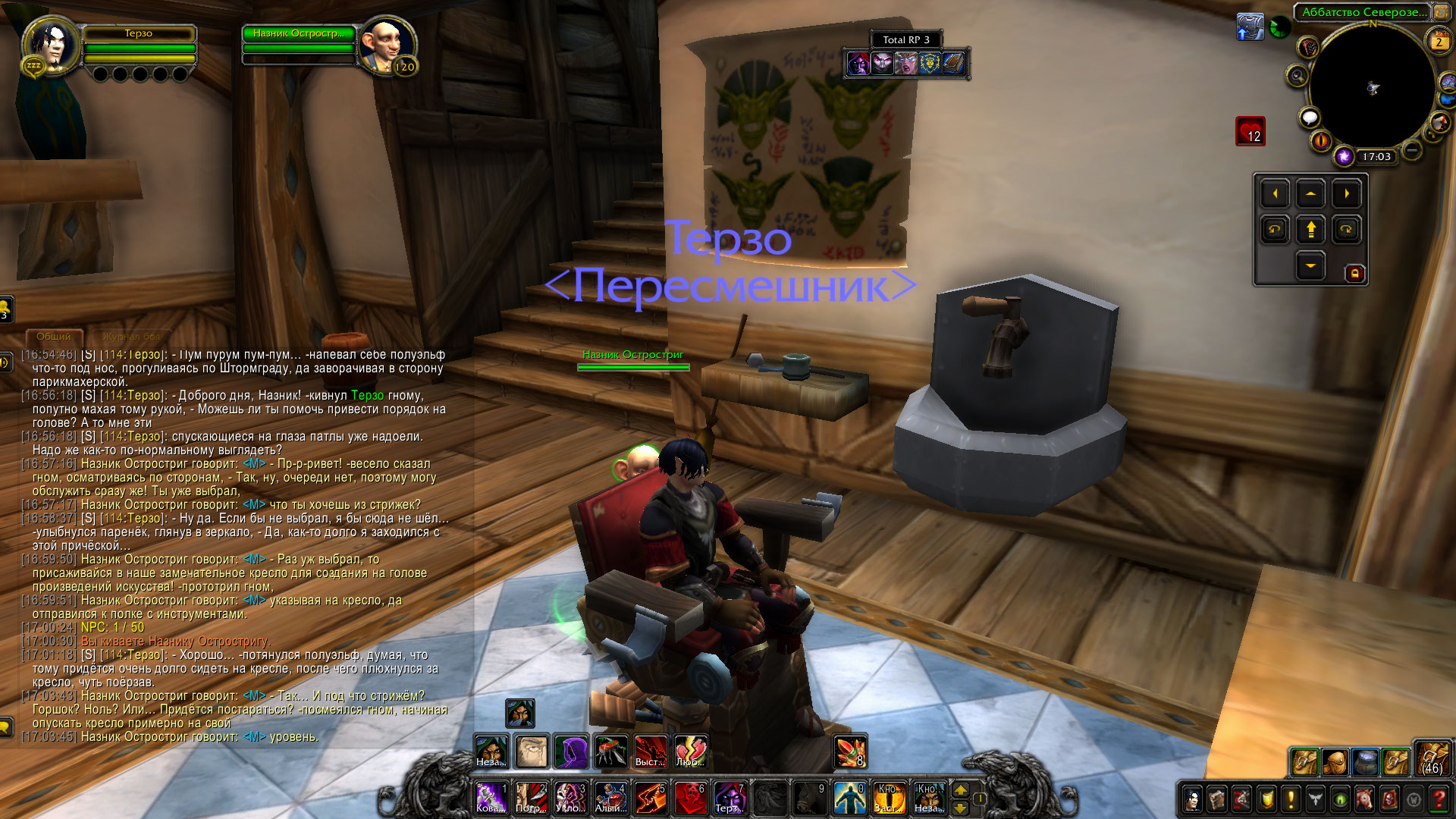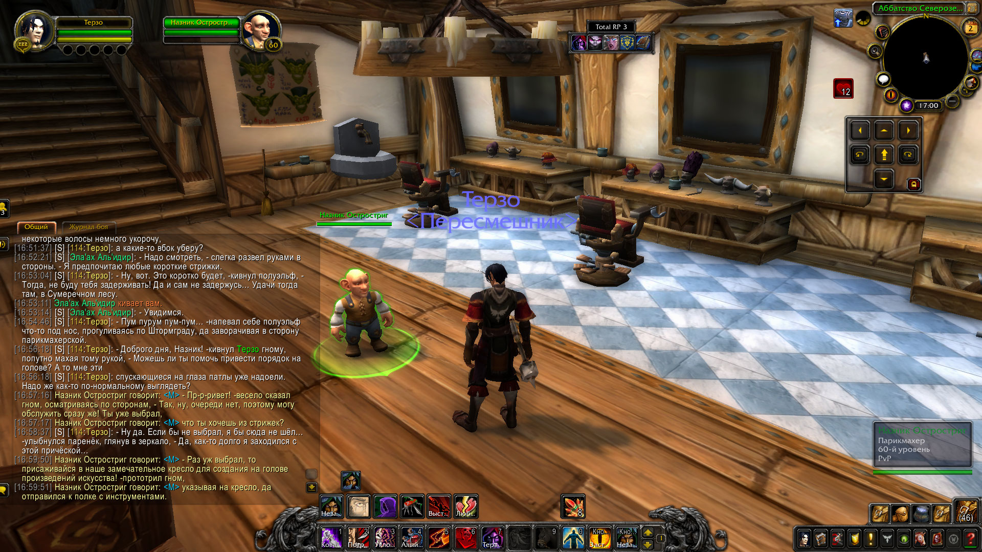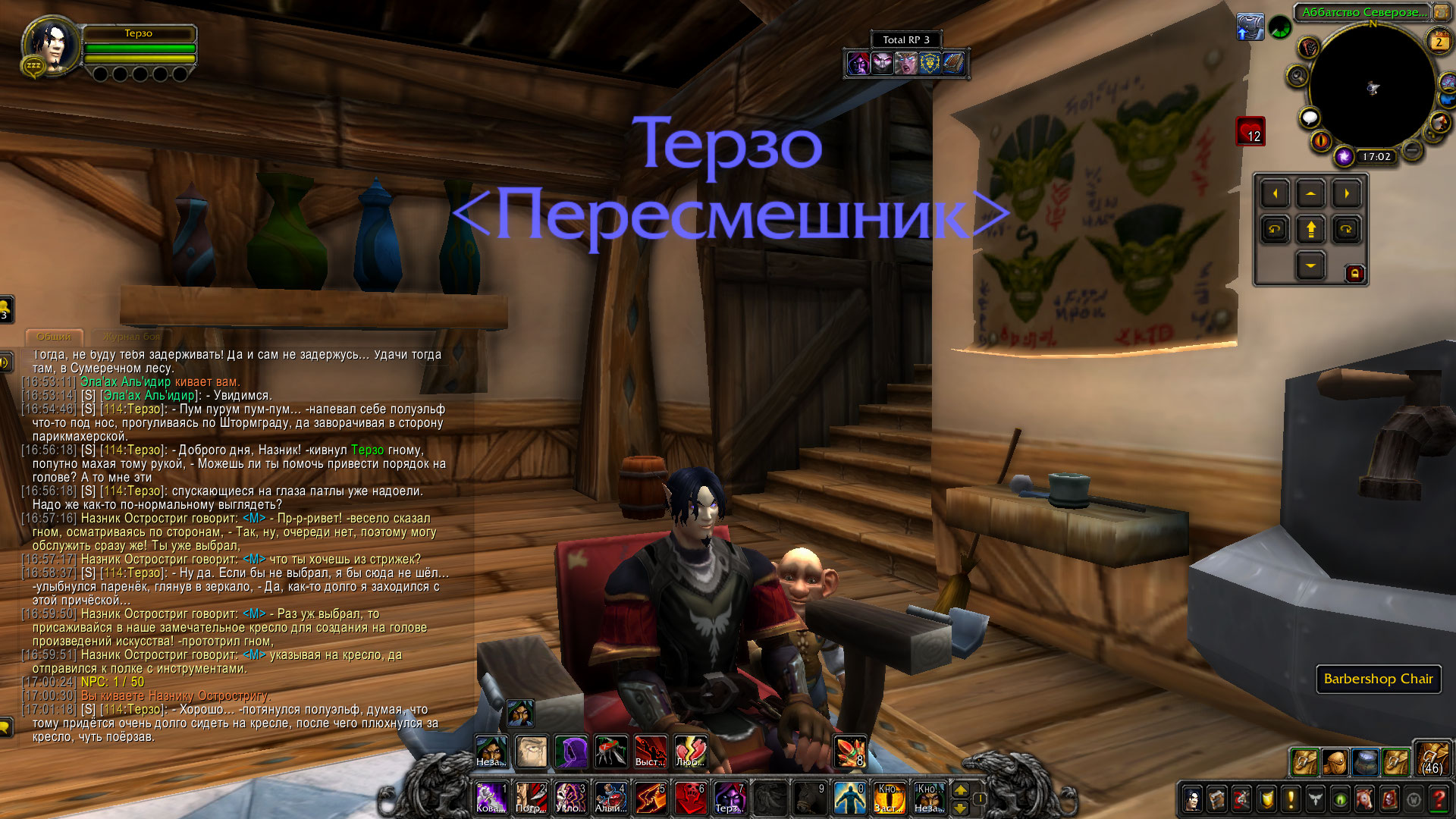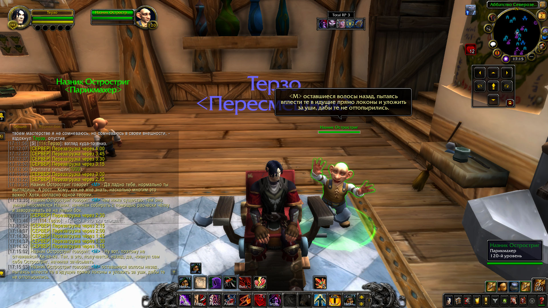 — Полуэльф Терзо прогулялся по Штормграду, дабы зайти в парикмахерскую. По пути он встретил своего друга эльфа Эла'Аха, с которым ещё успел посоветоваться по поводу того, надо ли менять полукровке стиль или нет. Решив, что всё-таки стоит, Терзо направился к тому самому Назвику Остростригу, дабы сменить причёску. После хитрых и не очень манипуляций, гном сделал Терзо новую причёску, зачёсывая чёлку вбок, а остальные волосы назад. Заплатив пару золотых цирюльнику.