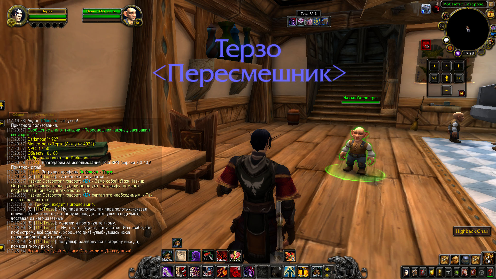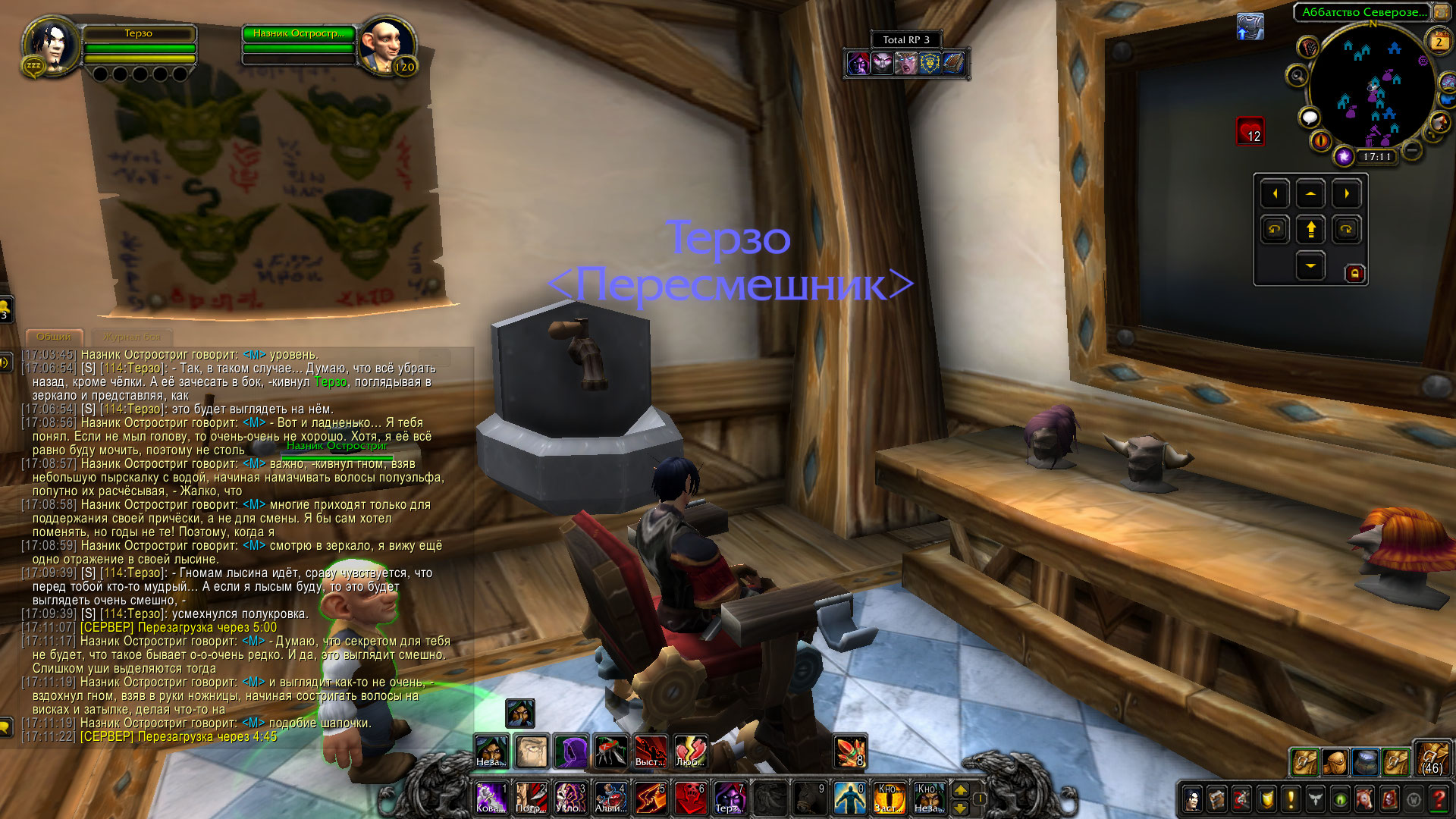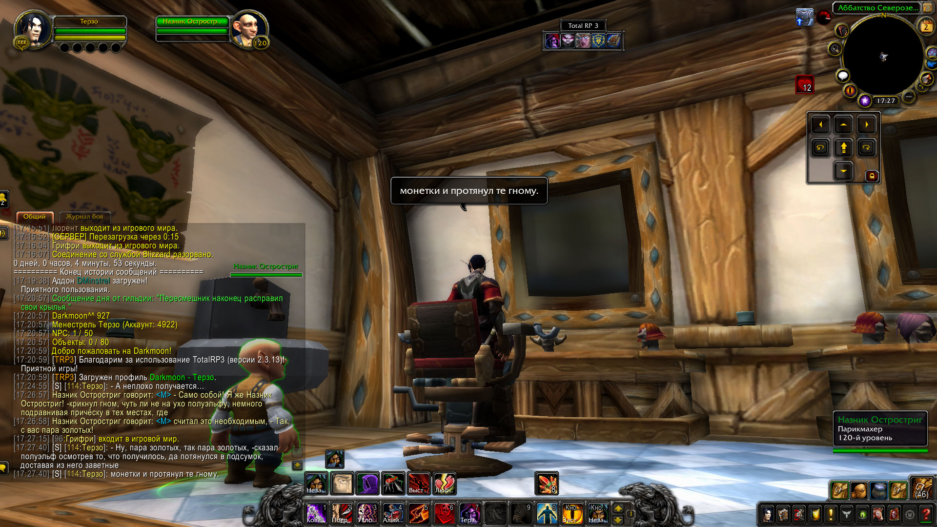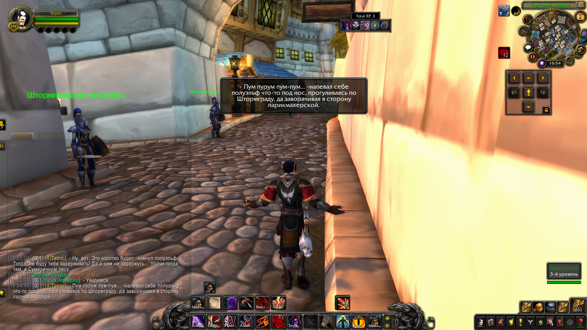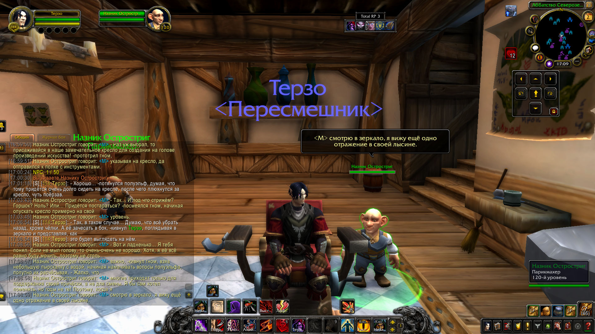 — Полуэльф Терзо прогулялся по Штормграду, дабы зайти в парикмахерскую. По пути он встретил своего друга эльфа Эла'Аха, с которым ещё успел посоветоваться по поводу того, надо ли менять полукровке стиль или нет. Решив, что всё-таки стоит, Терзо направился к тому самому Назвику Остростригу, дабы сменить причёску. После хитрых и не очень манипуляций, гном сделал Терзо новую причёску, зачёсывая чёлку вбок, а остальные волосы назад. Заплатив пару золотых цирюльнику.