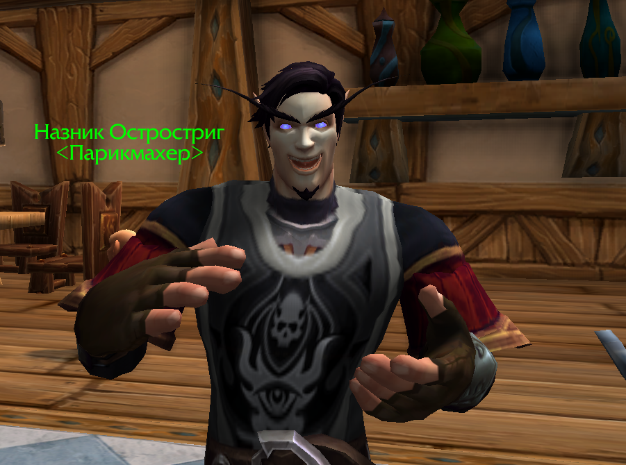 1. Полуэльф Терзо прогулялся по Штормграду, дабы зайти в парикмахерскую. По пути он встретил своего друга эльфа Эла'Аха, с которым ещё успел посоветоваться по поводу того, надо ли менять полукровке стиль или нет. Решив, что всё-таки стоит, Терзо направился к тому самому Назвику Остростригу, дабы сменить причёску. После хитрых и не очень манипуляций, гном сделал Терзо новую причёску, зачёсывая чёлку вбок, а остальные волосы назад. Заплатив пару золотых цирюльнику.
