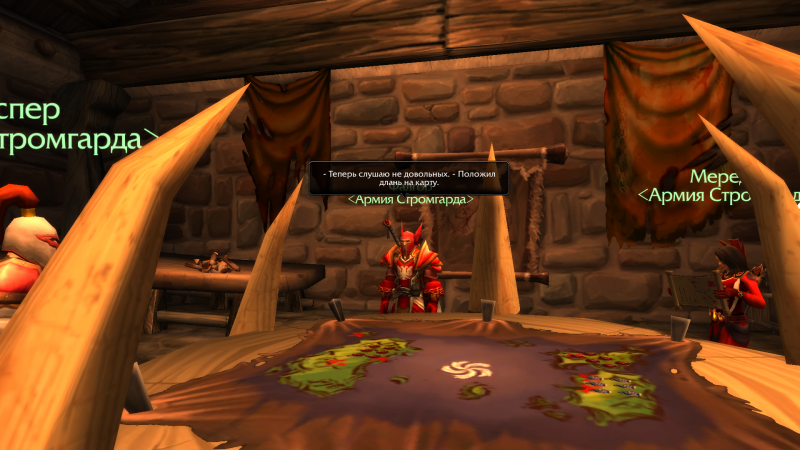 Все трепетали, входя в великую крепость Стромгард. Многие отдали жизнь за это, кого-то покалечили, но наконец-то солдаты вернулись домой. Предстояло много работы по восстановлению, но все были готовы к этому. Наконец, армия вошла в крепость. Торжествуя, солдаты собрались в тронном зале. Избавляясь от последних следов присутствия Орды, стромгардовцы собрались вокруг карты, обсуждая планы восстановления и текущую ситуацию.