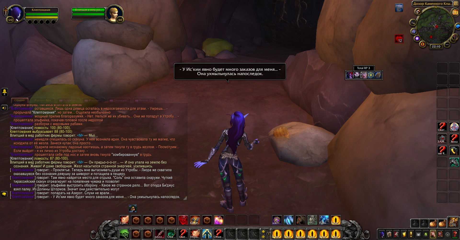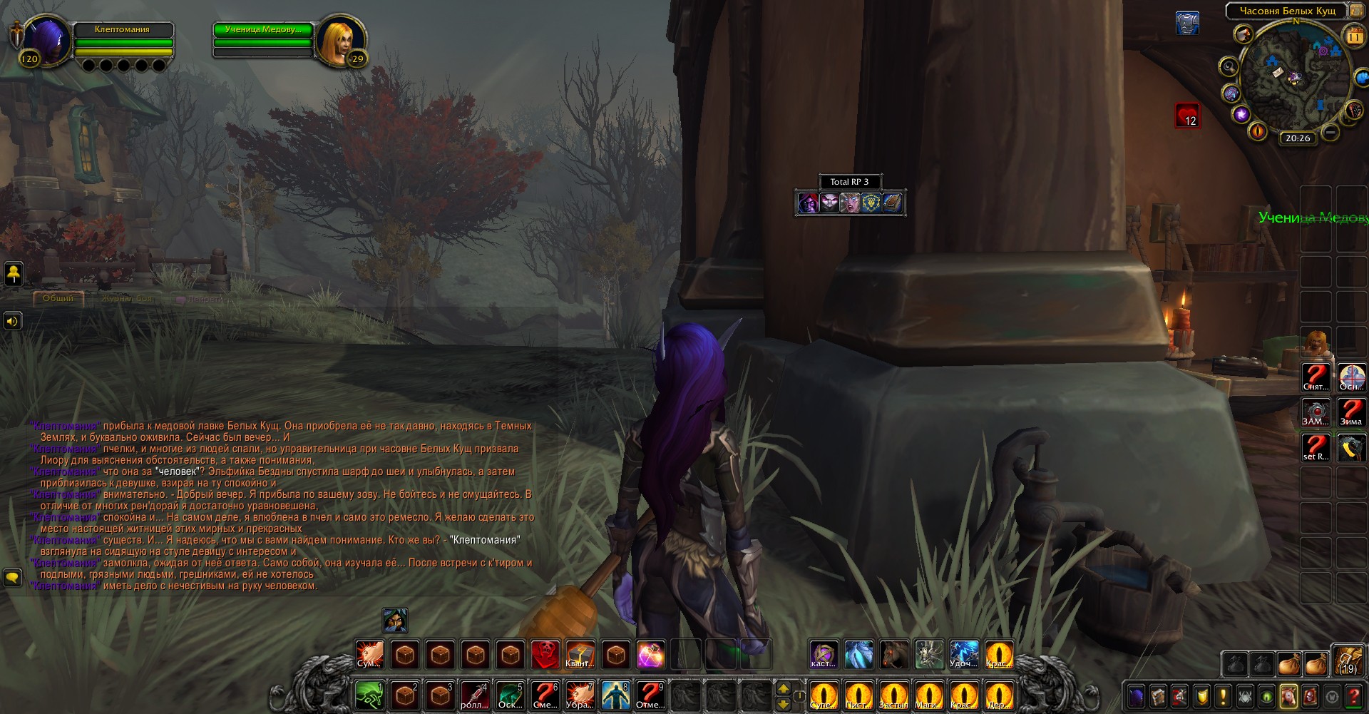 — «Клептомания» встретилась на территории медовой лавки Белых Кущ с одной из монахинь часовни Белых Кущ. Вместе с нею они обсудили дела и состояние самой эльфийки, лавки и пришли к консенсусу: она может не отчислять десятину часовне, но взамен монахиня будет наблюдать за продажей и производством мёда;